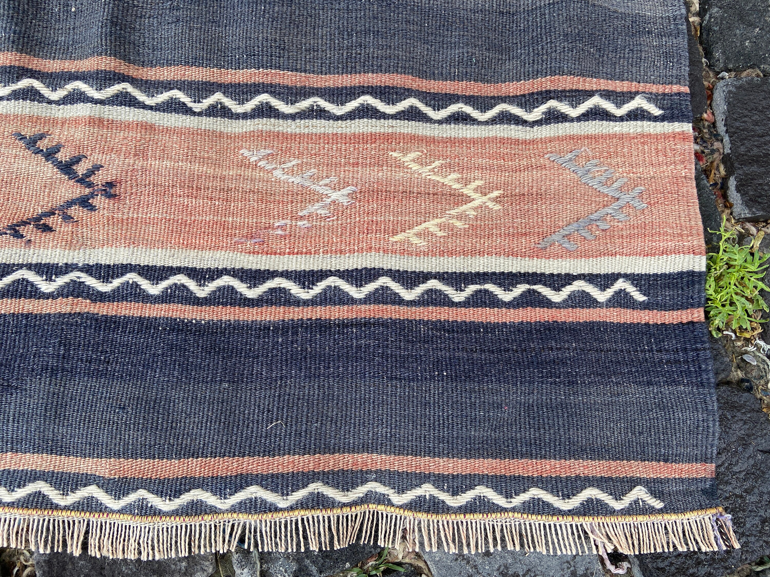 The rugs are hand knotted and the kilims are hand woven.They are slightly faded due to wear of the years.Due to the handmade vintage nature of rugs,All vintage rugs might have minor imperfections,repairs or signs of wear.