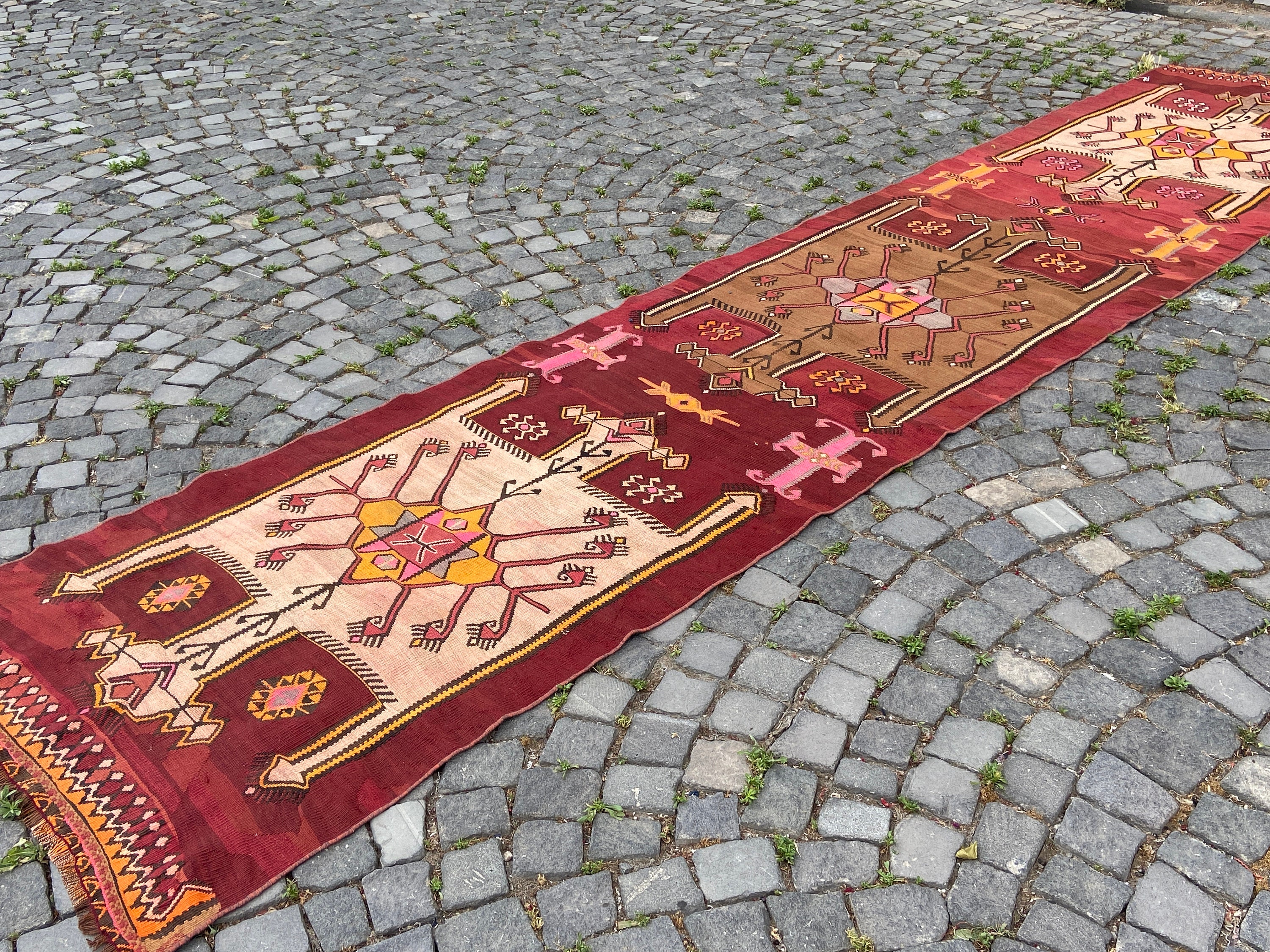 Transform your living space with this exquisite vintage rug. Its distinctive design and natural colors will add warmth and character to any room. As a hand-crafted piece with years of history woven into its fibers, this kilim brings a unique charm that mass-produced rugs simply cannot match. Whether placed in a hallway, corridor, or entryway, this rug will enhance the aesthetic of your home for generations to come.